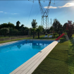 La piscina condivisa è grande e rilassante, circondata da un'area verde ideale per prendere il sole. I lettini a disposizione rendono perfetta ogni giornata estiva.